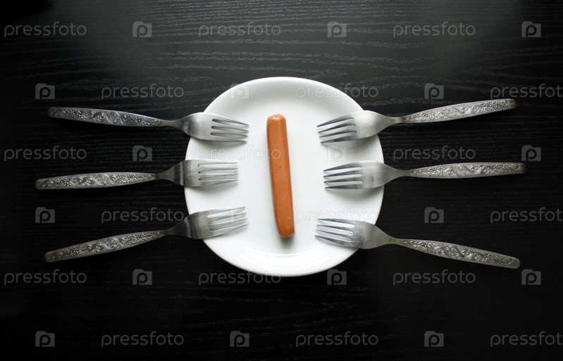 Сосиска на тарелке и шесть вилок вокруг