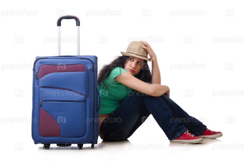 Молодая женщина с чемоданом, изолированная на белом