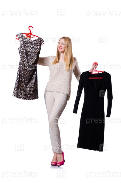 Женщина пытается выбрать платье на белом фоне