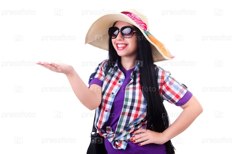Молодая женщина, готовая к летним каникулам, на белом фоне