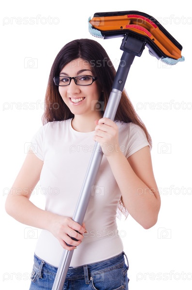 Молодая женщина с пылесосом на белом фоне
