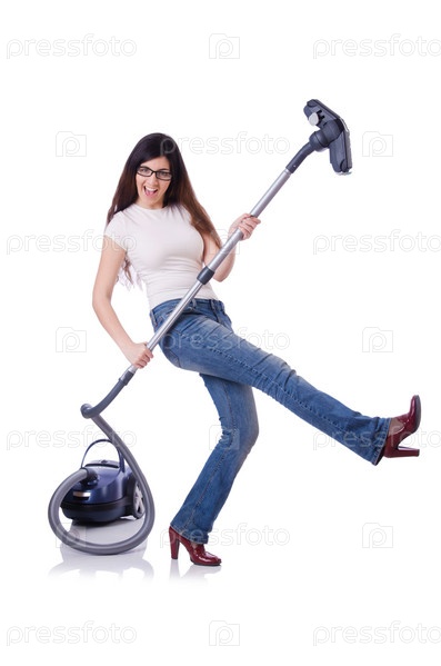 Молодая женщина с пылесосом на белом фоне