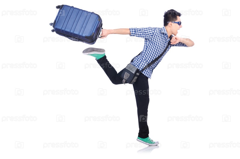 Парень с чемоданом на белом фоне