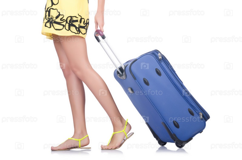 Молодая женщина с чемоданом на белом фоне