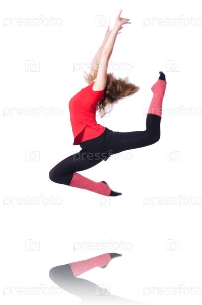 Молодая гимнасткка занимается на белом фоне