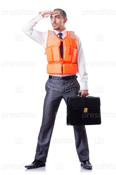 Мужчина в спасательном жилете, изолированный на белом