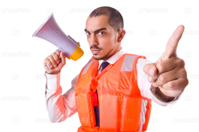 Мужчина в спасательном жилете, изолированный на белом