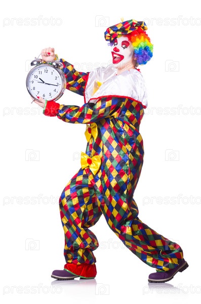 Клоун с часами на белом фоне