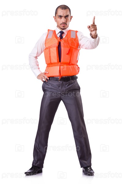 Мужчина в спасательном жилете, изолированный на белом