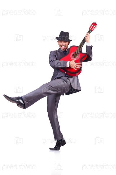 Бизнесмен играет на гитаре, изолированный на белом фоне
