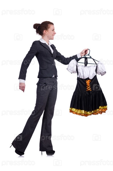 Женщина выбирает платье на белом фоне