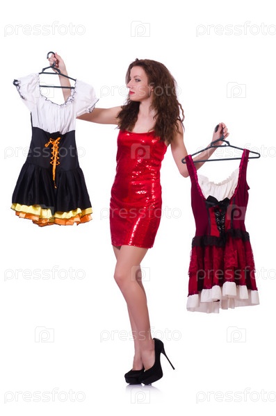Женщина выбирает платье на белом фоне
