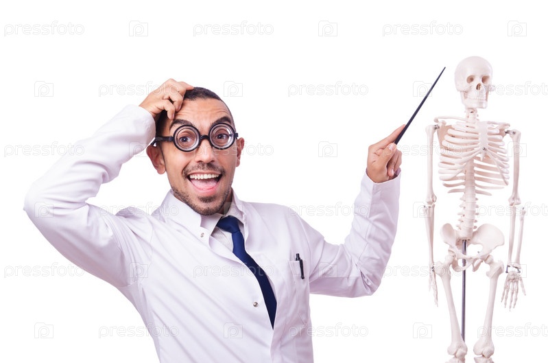 Забавный доктор со скелетом, изолированный на белом