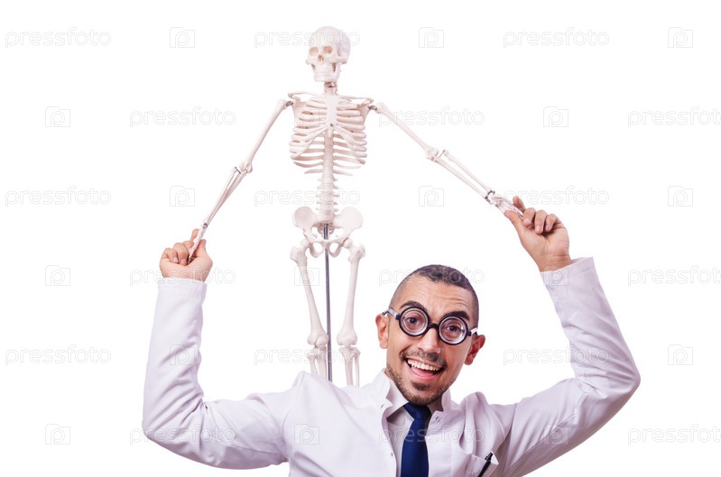 Забавный доктор со скелетом, изолированный на белом