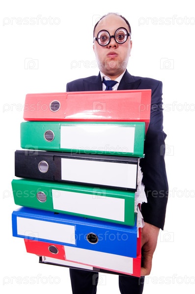 Забавный человек с большим количеством папок на белом фоне