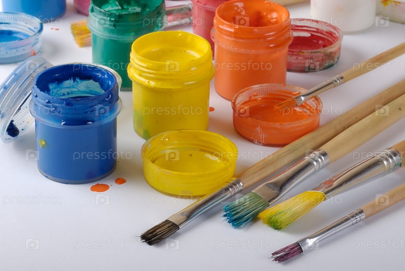 Баночки с цветными гуашевыми красками и кисти
