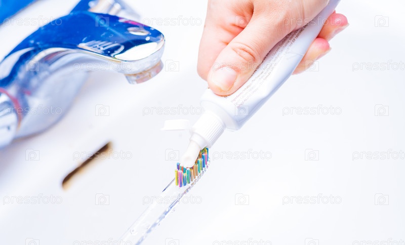 Выдавливание зубной пасты на зубную щетку