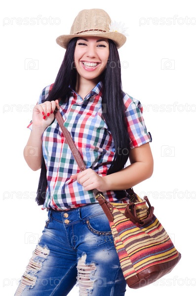 Молодая женщина, готовая к летним каникулам, на белом фоне