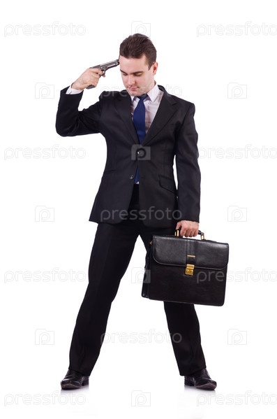 Бизнесмен с пистолетом, изолированный на белом