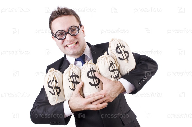 Бизнесмен с мешками денег на белом фоне