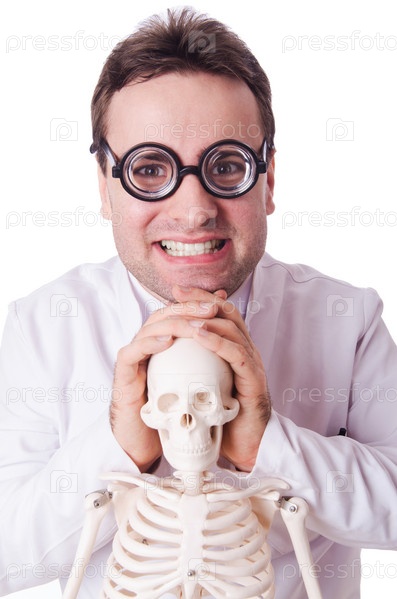 Забавный доктор со скелетом, изолированный на белом