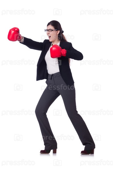 Бизнес-леди с боксерскими перчатками на белом фоне