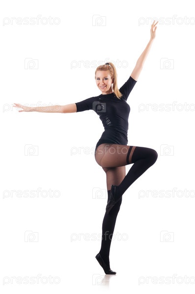 Молодая женщина танцует на белом фоне