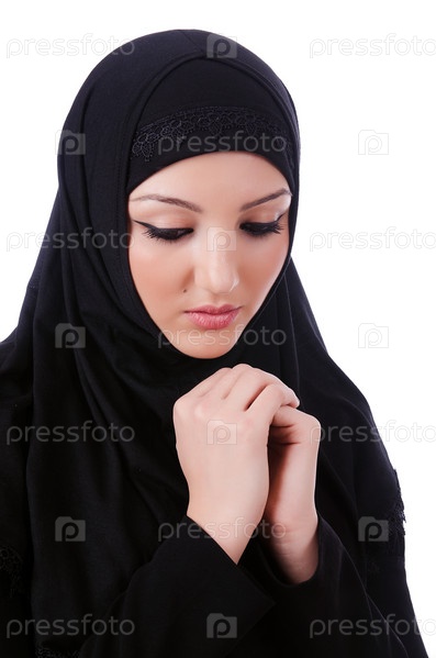 Мусульманская молодая женщина в хиджабе на белом фоне