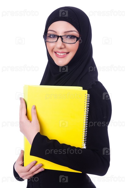 Молодая мусульманская женщина с книгой на белом фоне