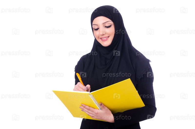 Мусульманская молодая женщина в хиджабе на белом фоне