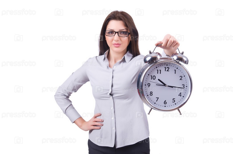 Женщина с часами, изолированная на белом