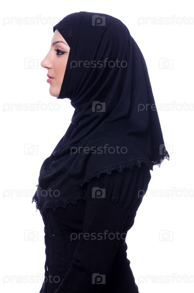 Мусульманская молодая женщина в хиджабе на белом фоне