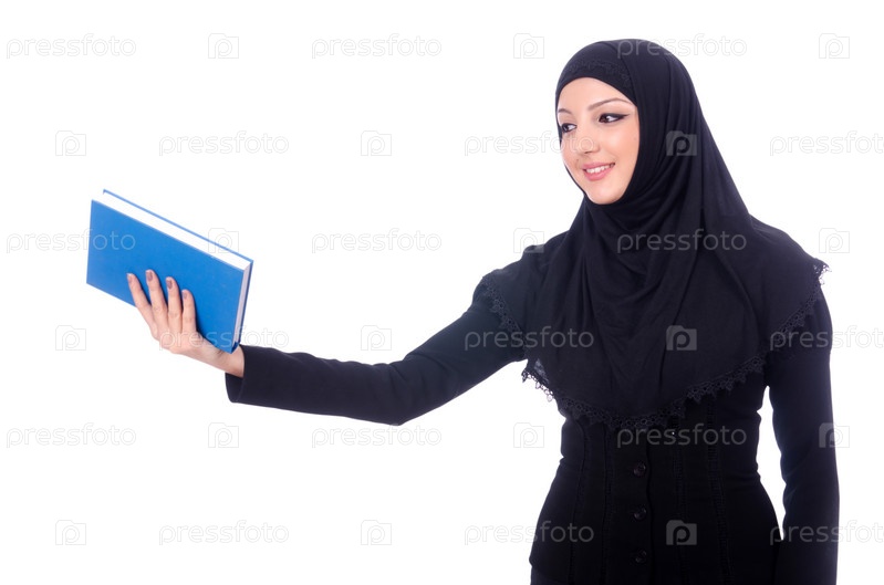 Мусульманская молодая женщина в хиджабе на белом фоне