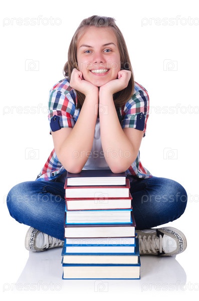 Девушка студентка с книгами на белом фоне