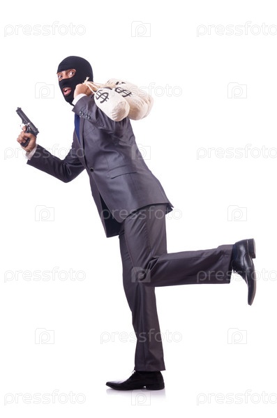 Бандит с мешками денег на белом фоне