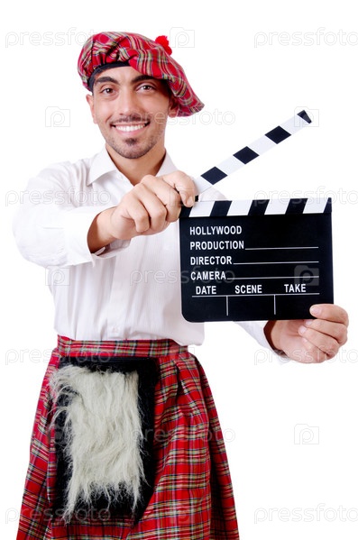 Шотландец с хлопушкой на белом фоне