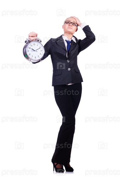 Женщина с гигантскими часами на белом фоне