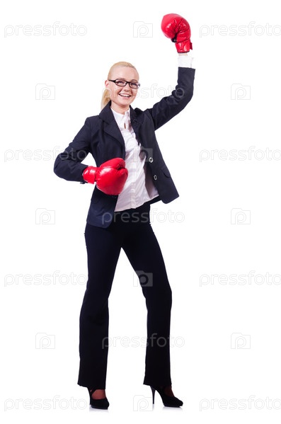 Деловая женщина в боксерских перчатках на белом фоне