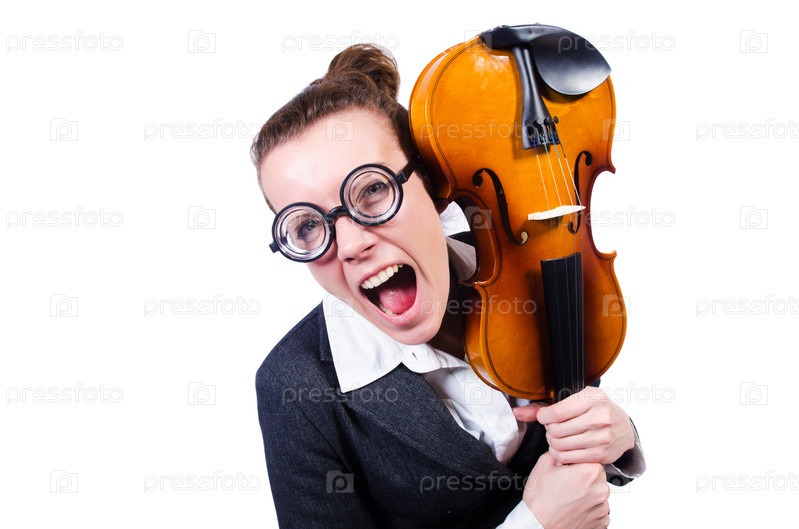 Бизнес-леди со скрипкой, изолированная на белом фоне