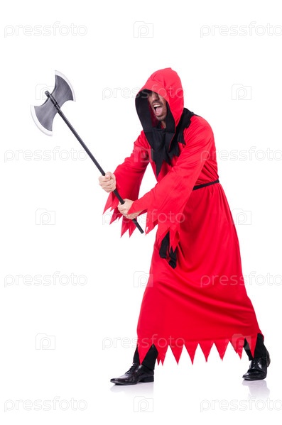 Палач в красном костюме с топором на белом фоне