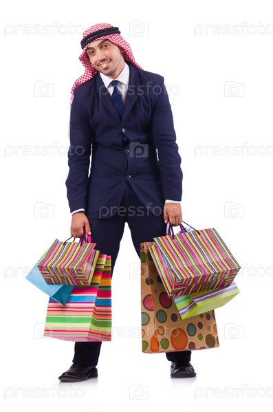 Араб с покупками на белом фоне