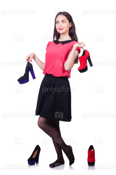 Молодая женщина выбирает обувь на белом фоне
