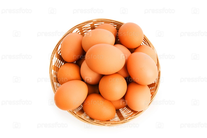 Коричневые яйца в корзинке на белом