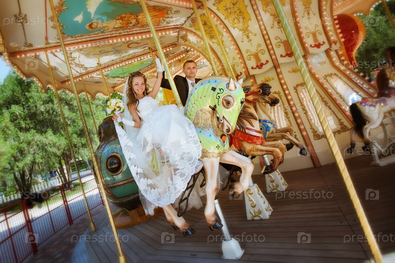 Красивые невеста и жених катаются на карусели