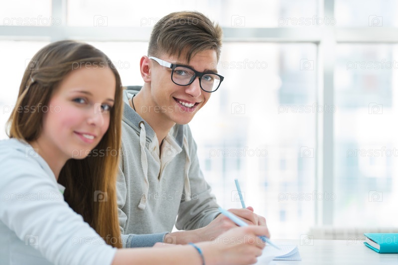 Учащиеся средней школы. Девочка и мальчик помогают друг другу на уроке