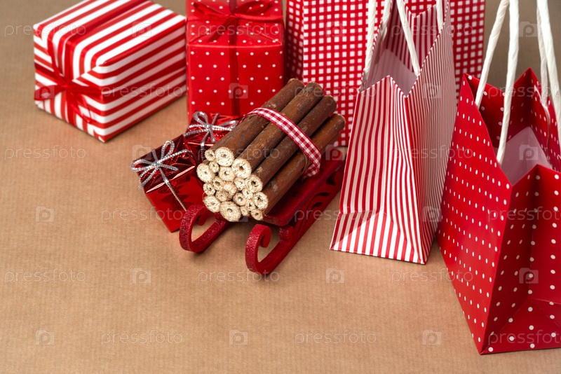 Рождественский фон с красными украшениями, пакетиками и коробками