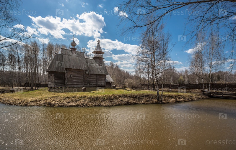 Древний деревянный храм стоит на берегу реки