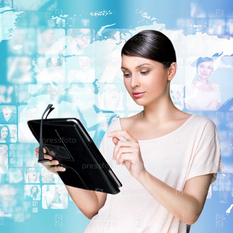 Портрет молодой женщины с планшетным компьютером. Общение с друзьями по всему миру. Концепция международных коммуникаций
