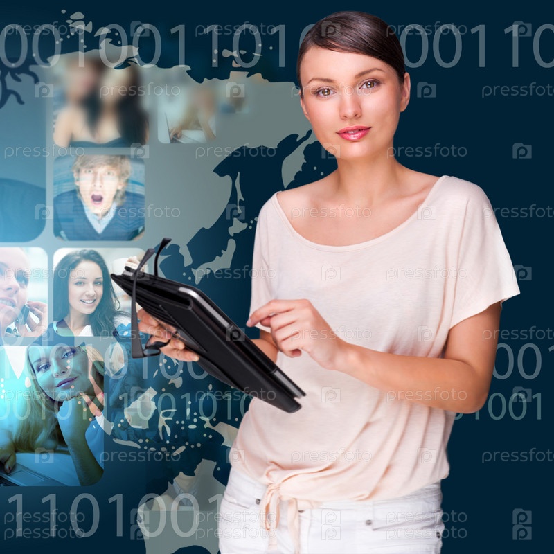 Портрет молодой женщины с планшетным компьютером. Общение с друзьями по всему миру. Концепция международных коммуникаций