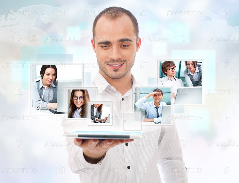 Взрослый бизнесмен и планшетный компьютер для общения. Технология виртуального совещания, концепция глобального бизнеса